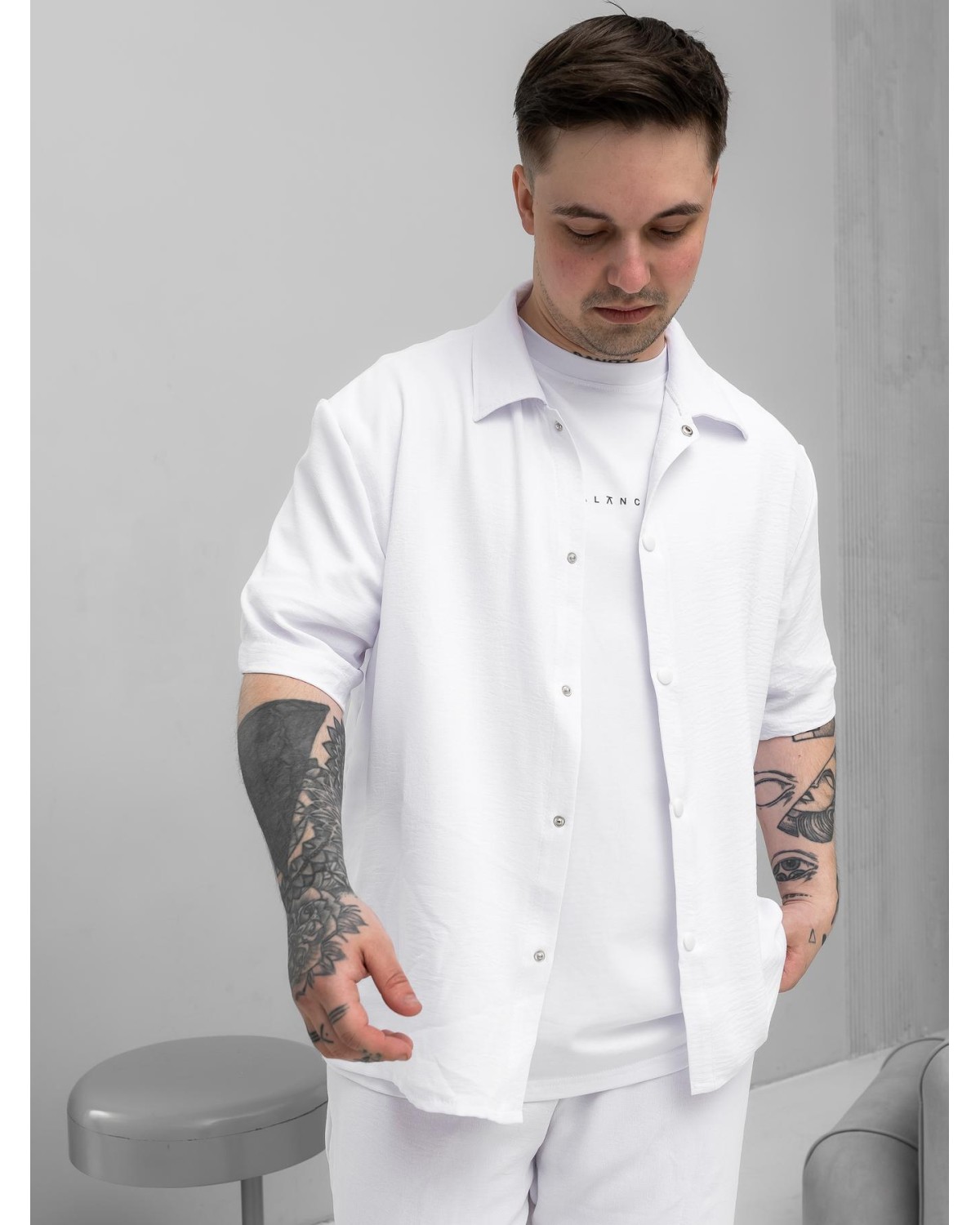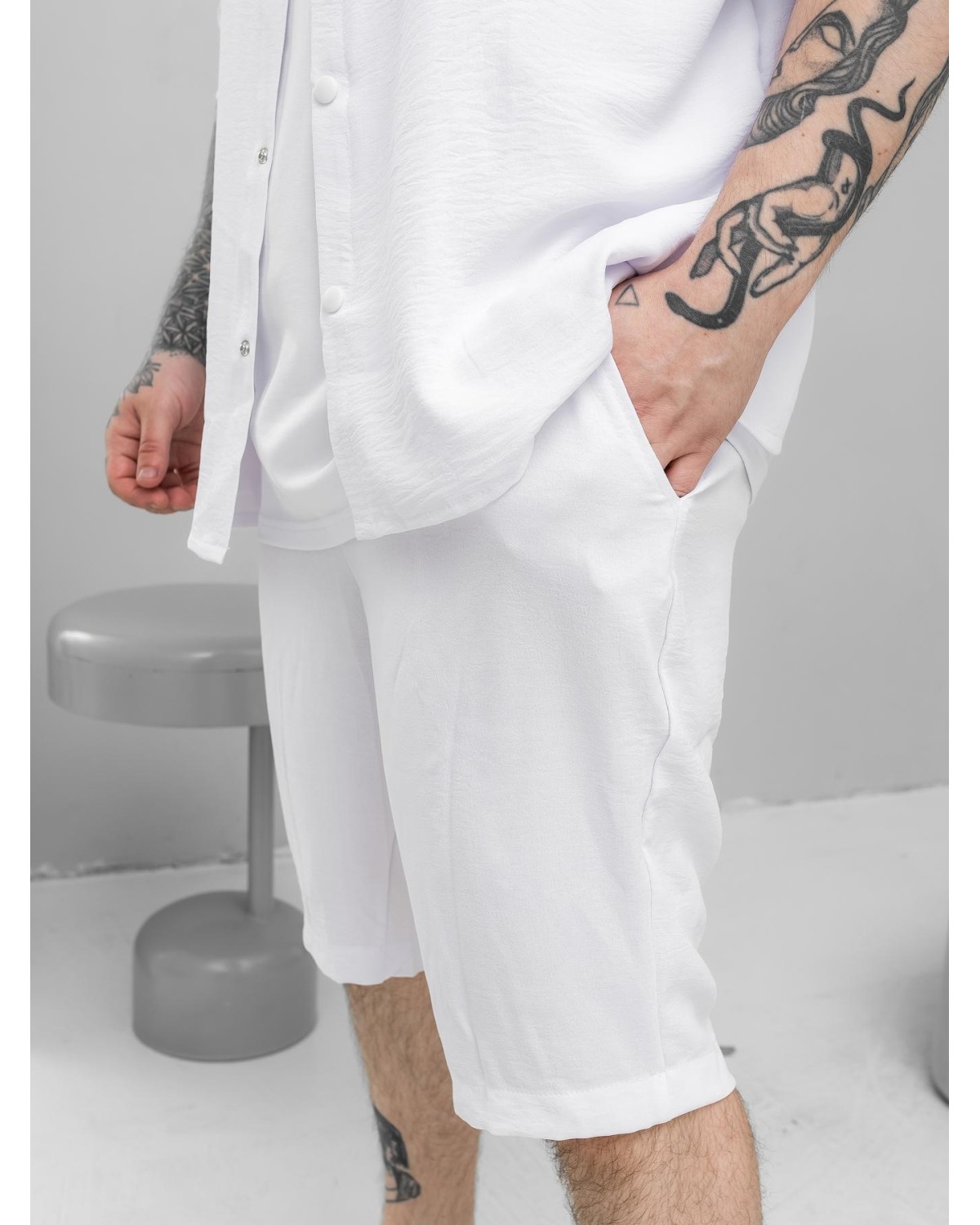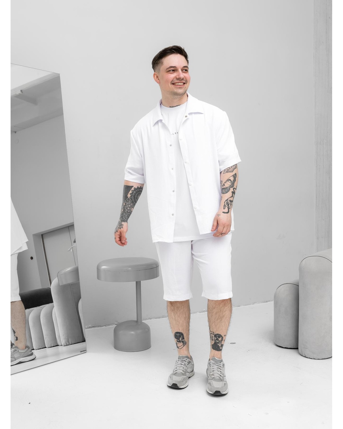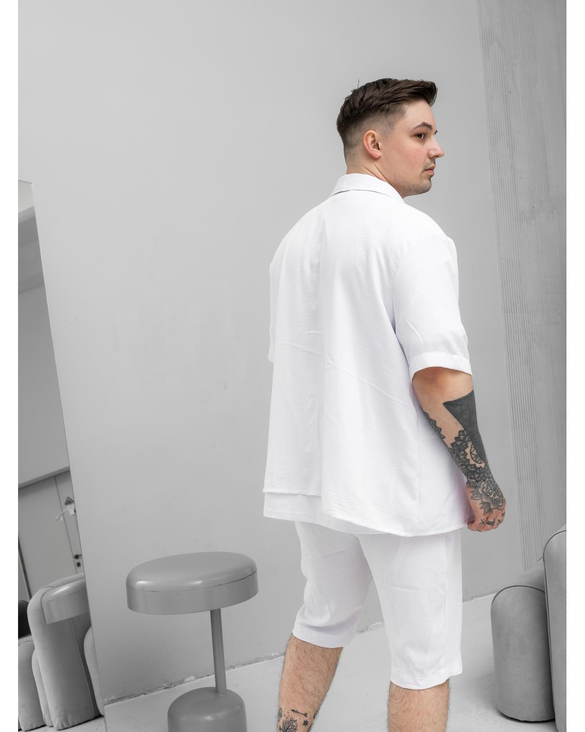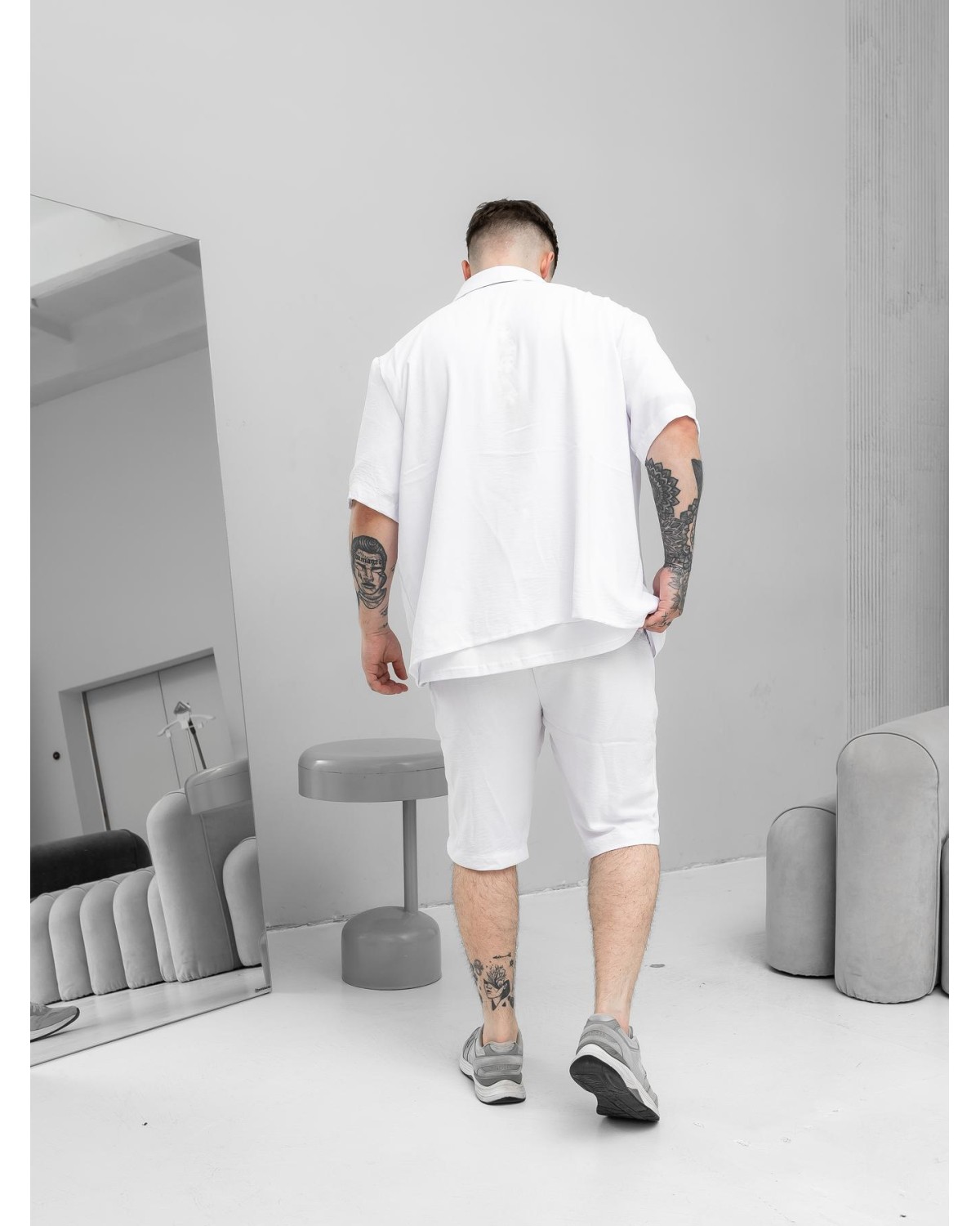 Літній комплект у білому кольорі, що складається з сорочки з коротким рукавом та шортів. Модель виконана з легкого крепу, який забезпечує комфорт у спекотну погоду.