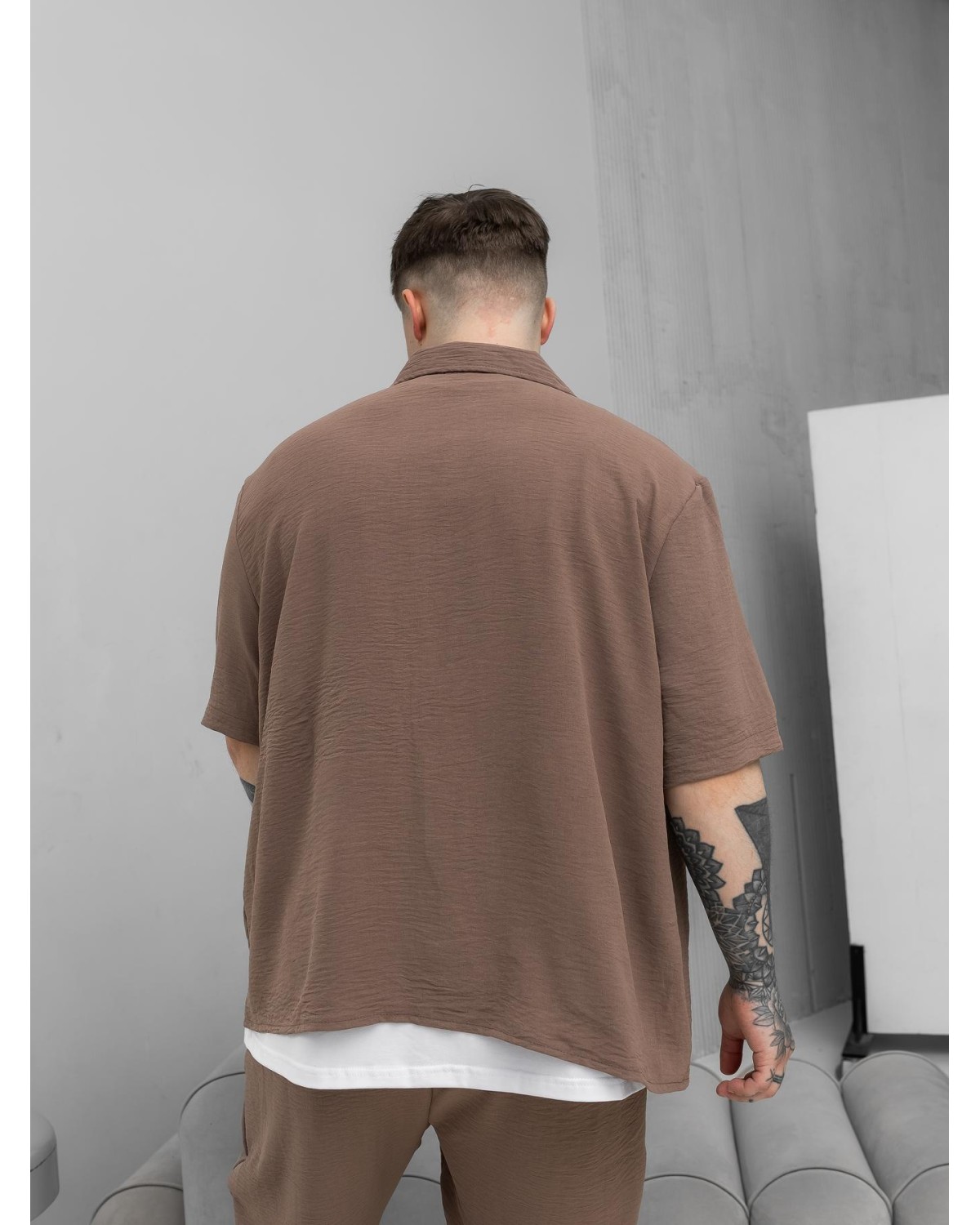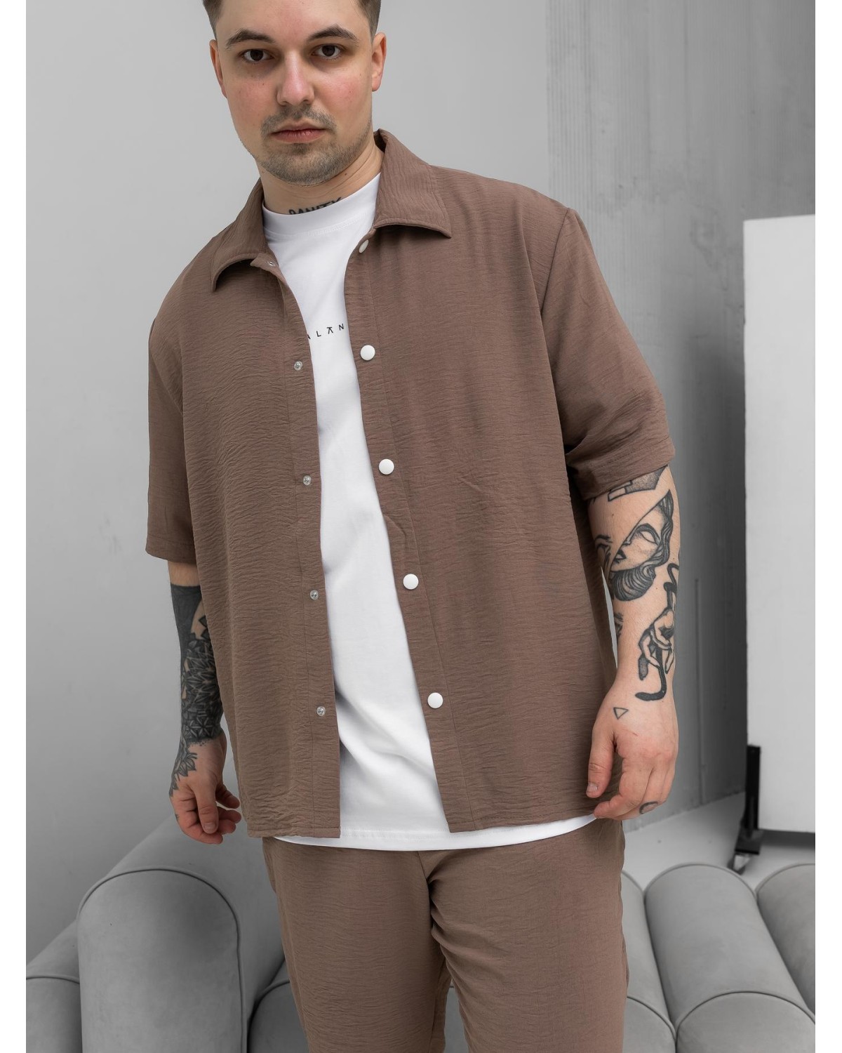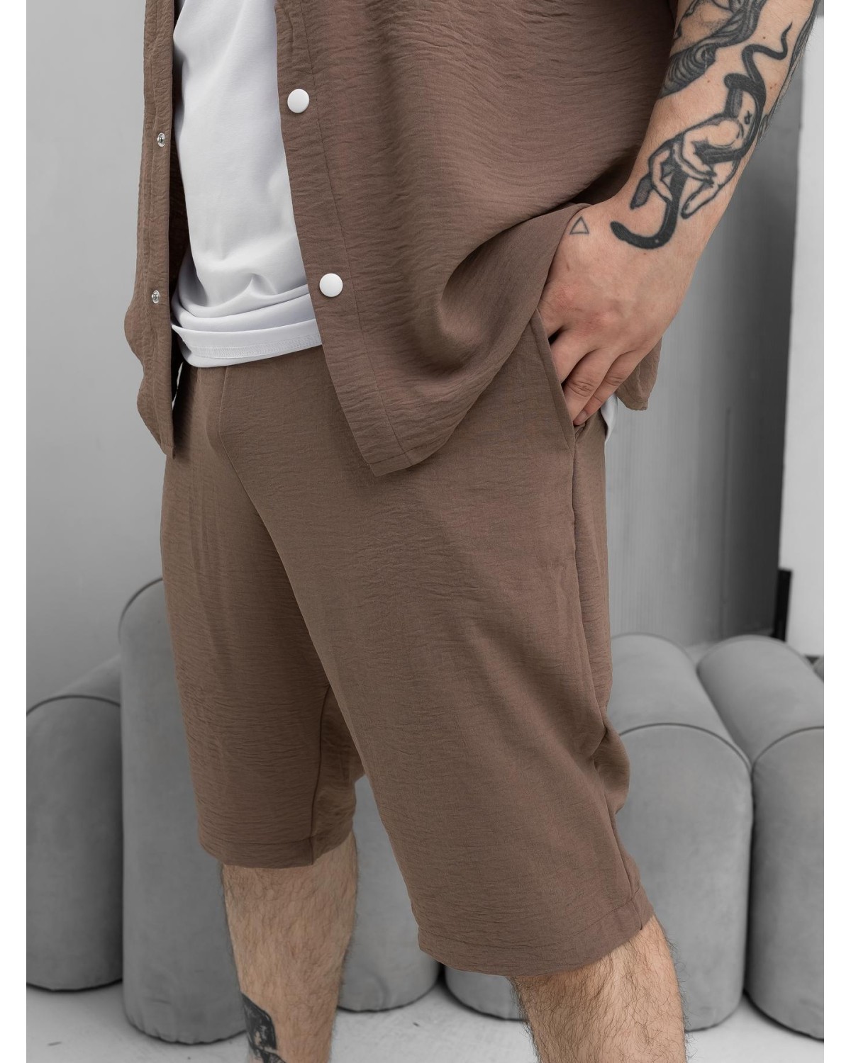 Легкий комплект у відтінку какао для сезону весна–літо. Складається з сорочки з коротким рукавом та шортів. Модель виконана з крепу, що забезпечує комфорт і легкість у спекотну погоду.