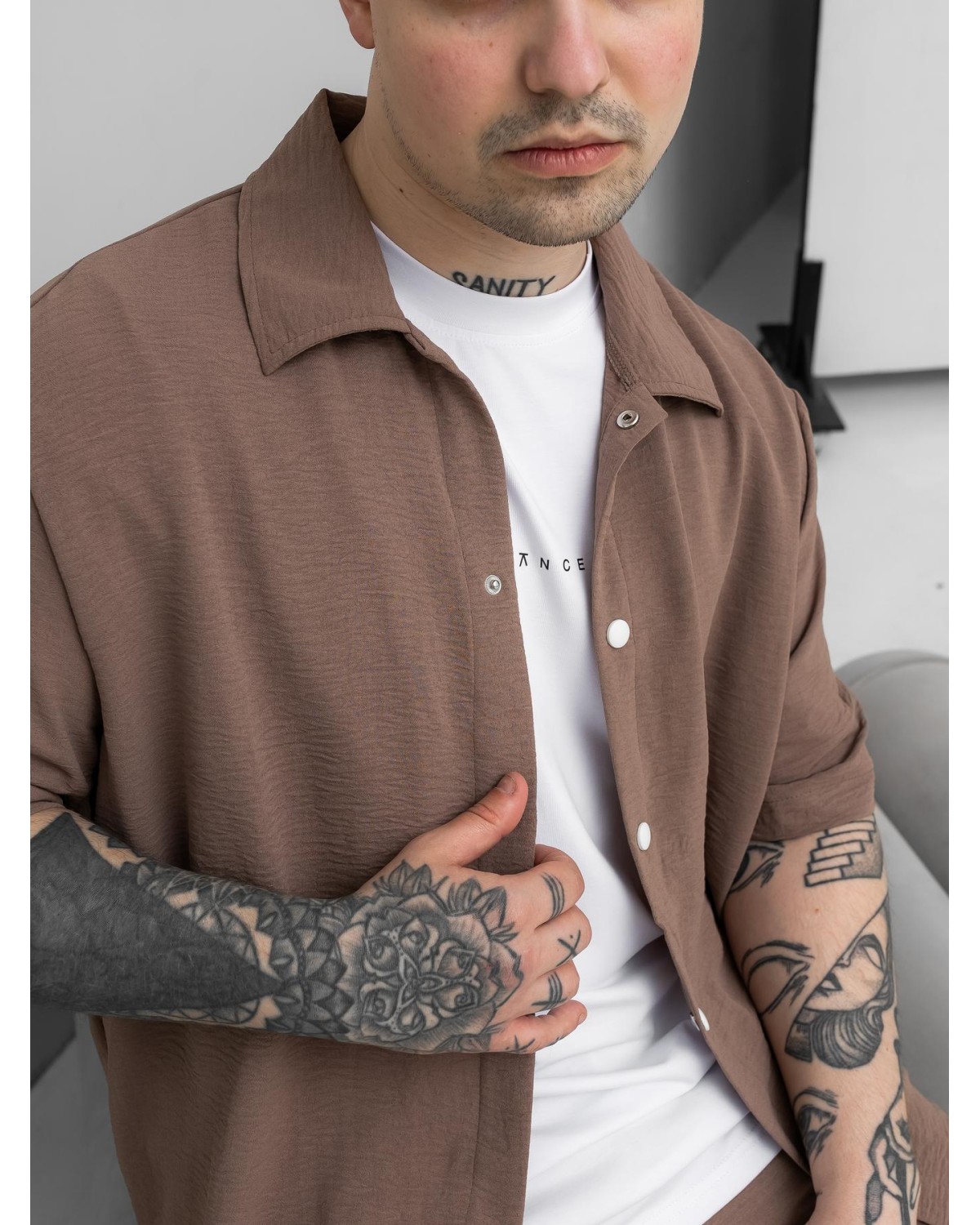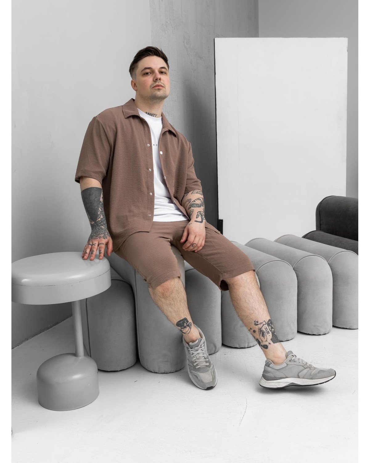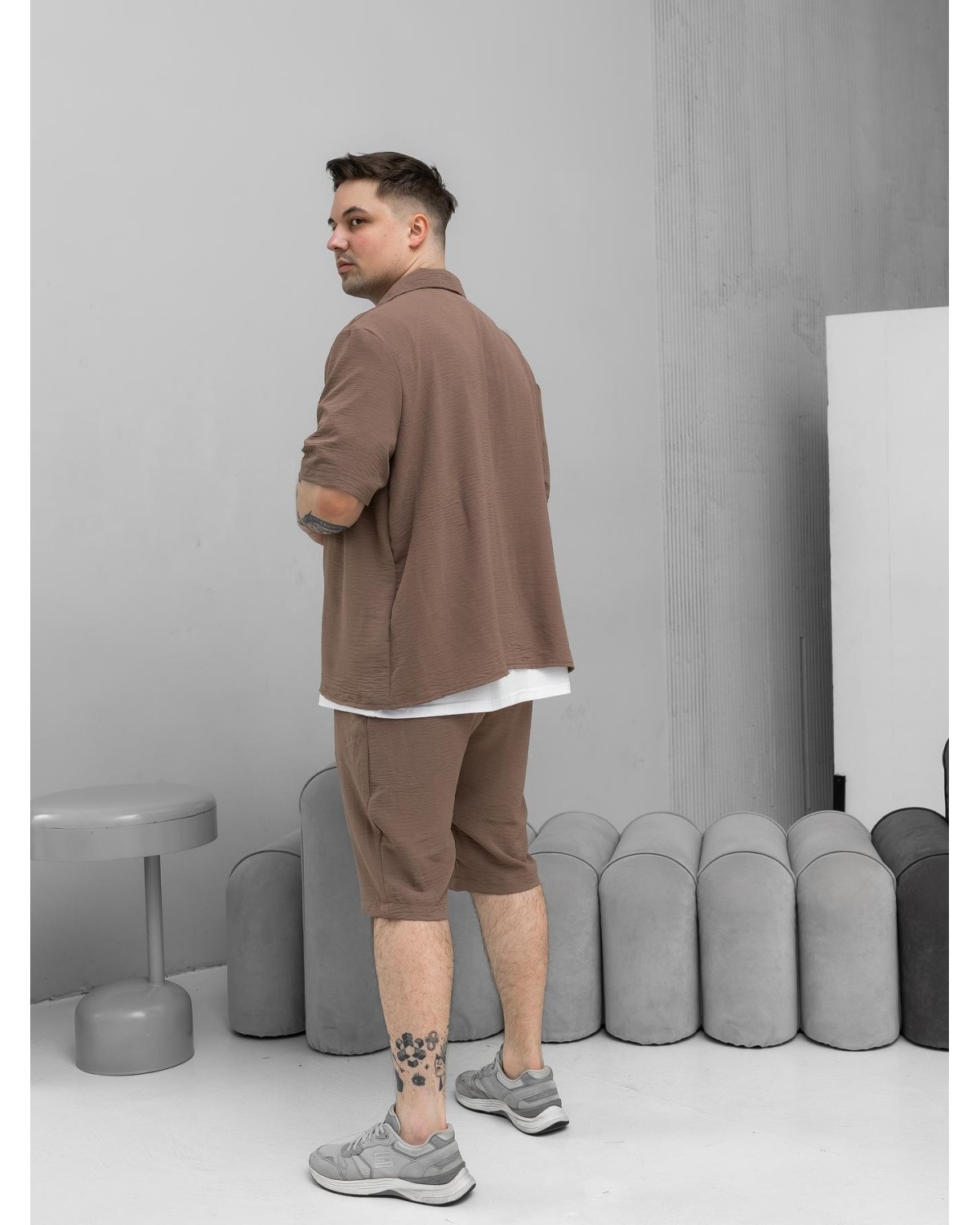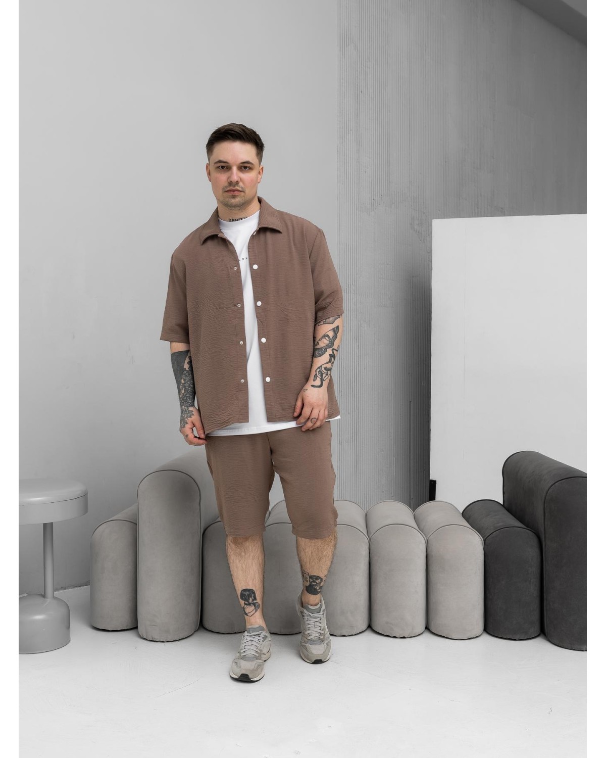 Легкий комплект у відтінку какао для сезону весна–літо. Складається з сорочки з коротким рукавом та шортів. Модель виконана з крепу, що забезпечує комфорт і легкість у спекотну погоду.