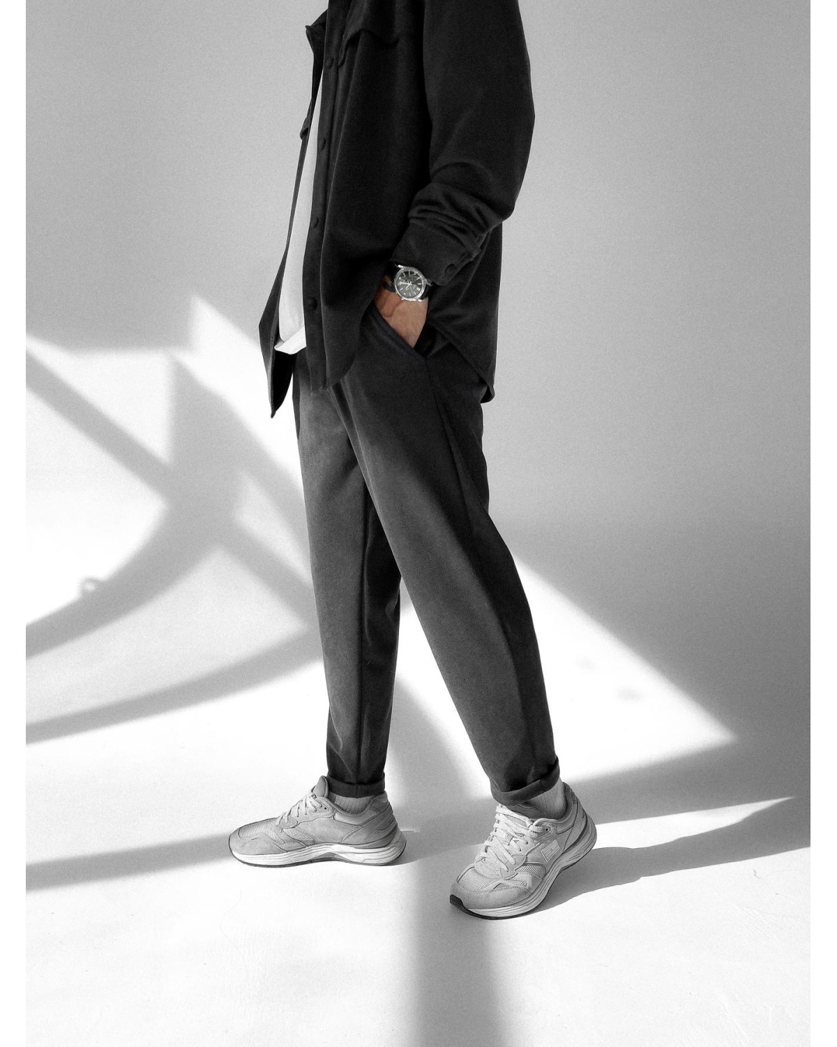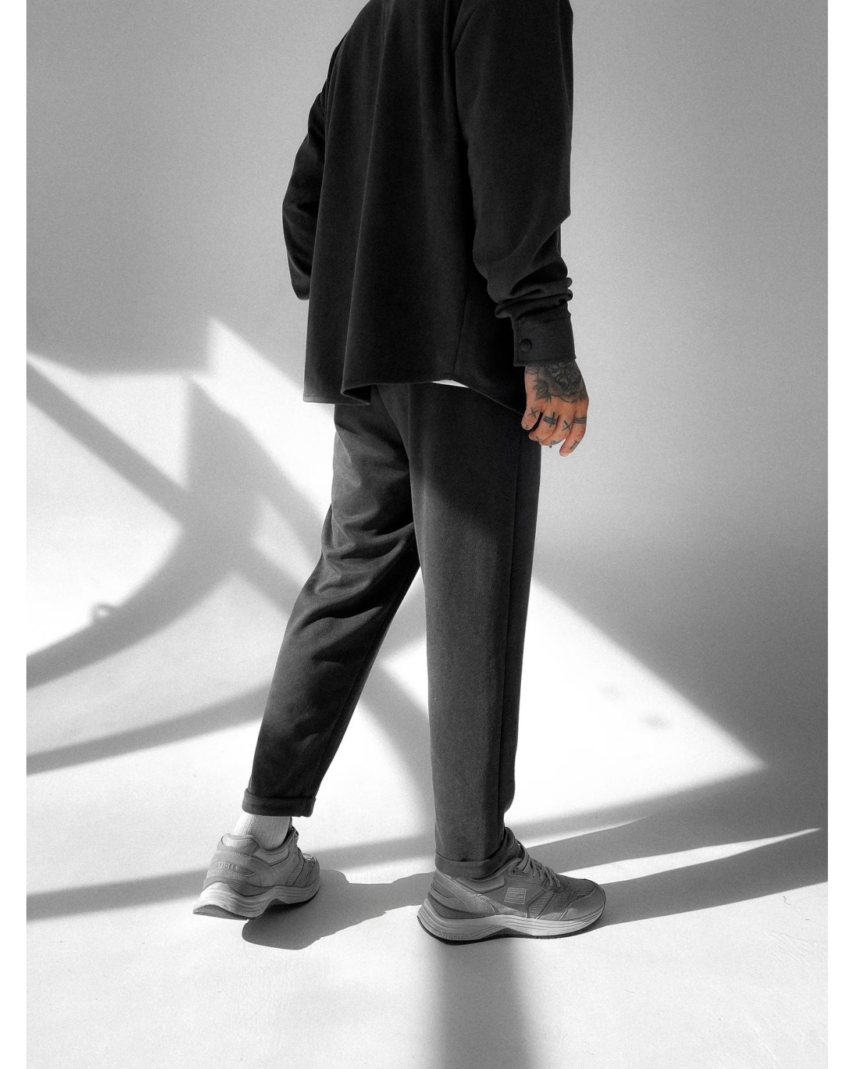 Стильні штани з м’якого замшевого коттону у графітовому кольорі. Модель розрахована на повсякденне носіння та добре підходить для прохолоднішої погоди.